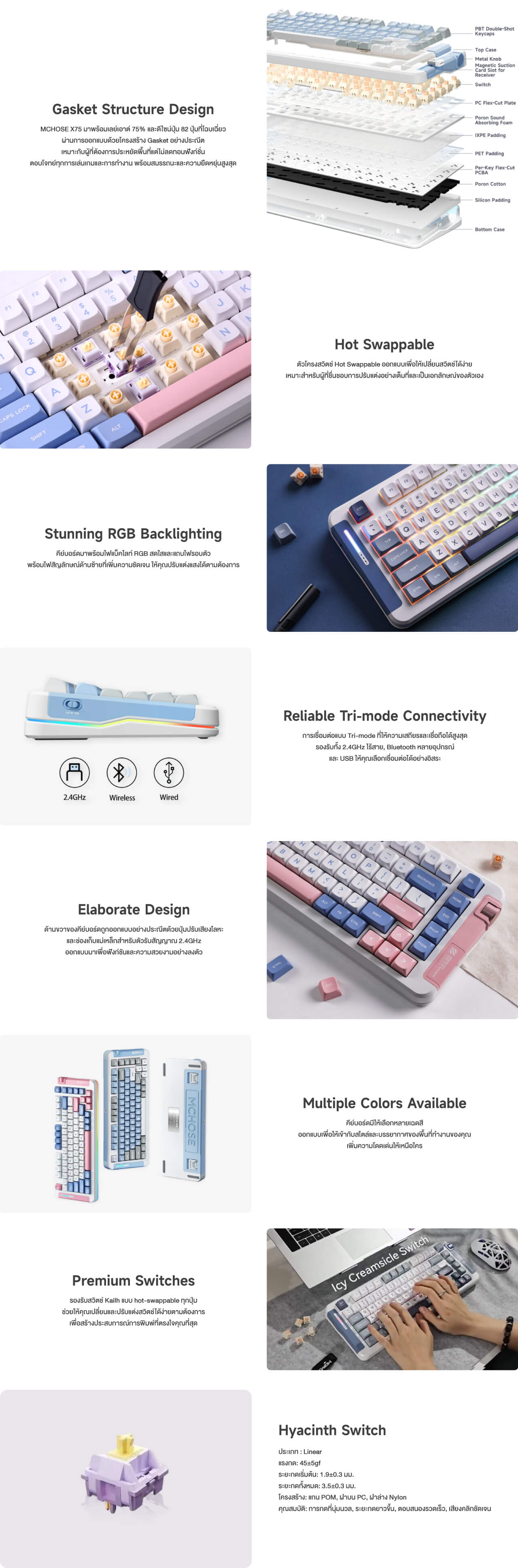 คีย์บอร์ด MCHOSE X75 Blue & Grey — Tri-mode คัสตอมเกมมิ่งคีย์บอร์ด 75% 82 คีย์ ดีไซน์เฉียบ กะทัดรัด ฟังก์ชันครบ ปรับแต่งระดับโปร รวมไว้ในหนึ่งเดียว ทั้งทำงานและเล่นเกมก็ได้ประสิทธิภาพสูงสุดในพื้นที่ที่ลงตัว