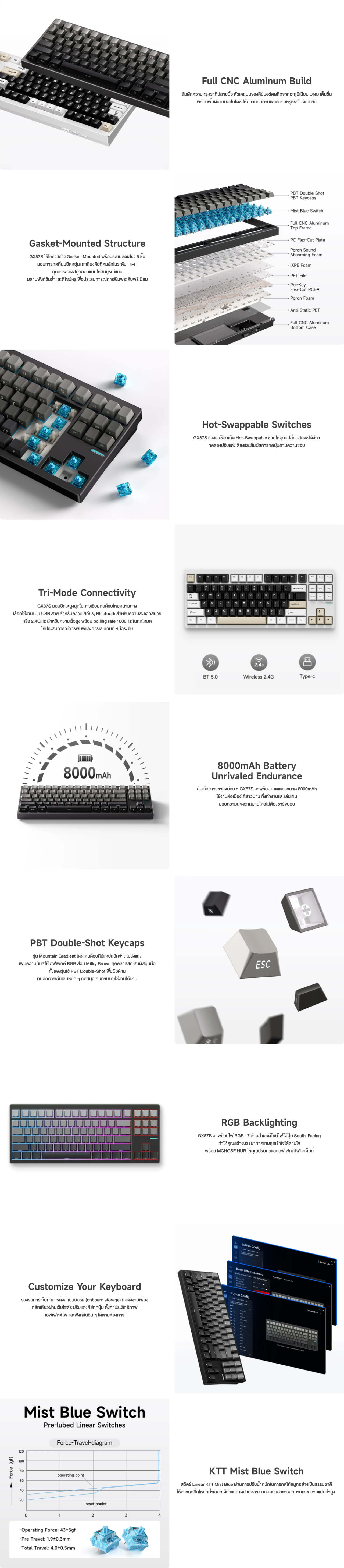 คีย์บอร์ดเกมมิ่ง 80% (TKL) ระดับพรีเมียมที่หรูหราด้วยตัวเคส CNC Aluminum โครงสร้าง Gasket Mount และการเชื่อมต่อ 3 โหมด ดีไซน์ Mountains Gradient สุดอาร์ต พร้อมแบตเตอรี่ 8000mAh และสวิตช์ KTT Mist Blue Linear ที่ให้เสียงพิมพ์ "Thocky" นุ่มนวล