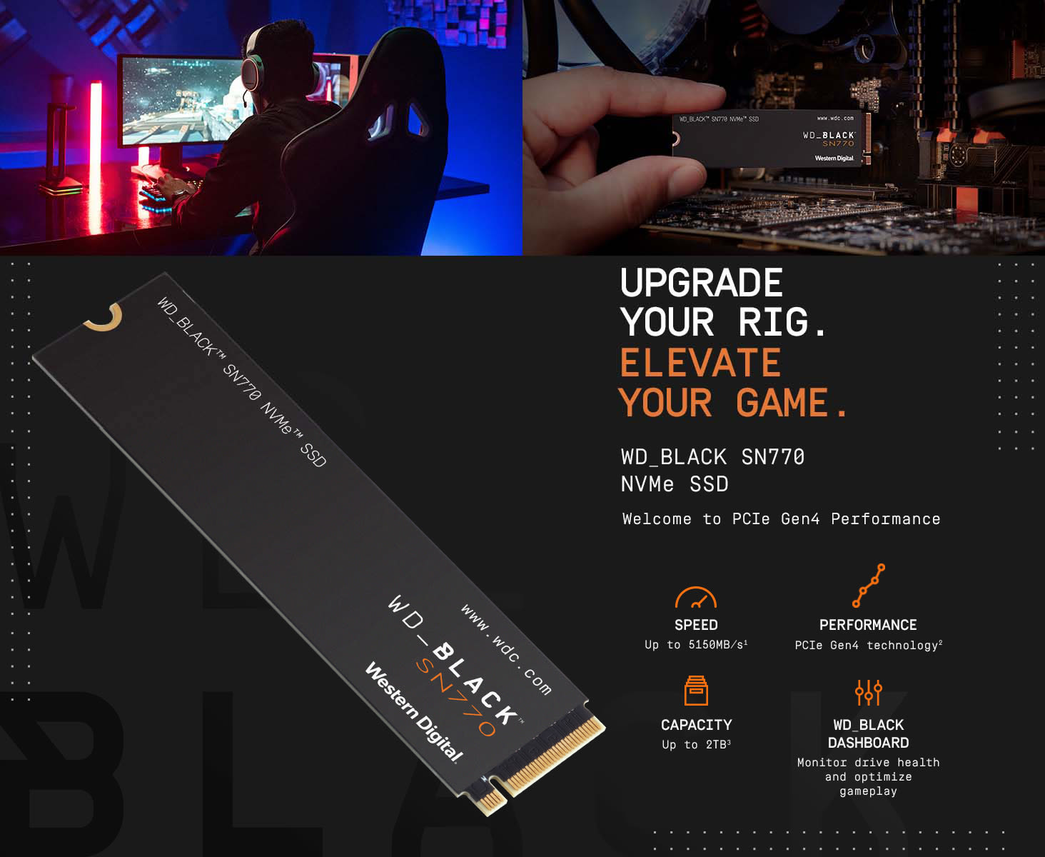 500GB WD BLACK SN770 NVMe ไดรฟ์เกมที่สร้างขึ้นโดยเฉพาะนี้ ใช้อินเทอร์เฟซ PCIe® Gen4 ที่มอบความเร็วชั่วพริบตาเดียวคือสูงสุดถึง 5,150 MB/s (รุ่น 1 TB และ 2 TB) เพิ่มประสบการณ์เล่นเกมและการสตรีมให้รวดเร็วไหลลื่นด้วยอินเทอร์เฟซ PCIe Gen4 ที่มอบประสิทธิภาพเพื่อปรับปรุงการมองเห็นและความรู้สึกของคุณ