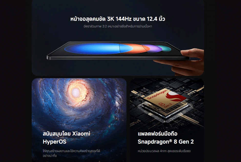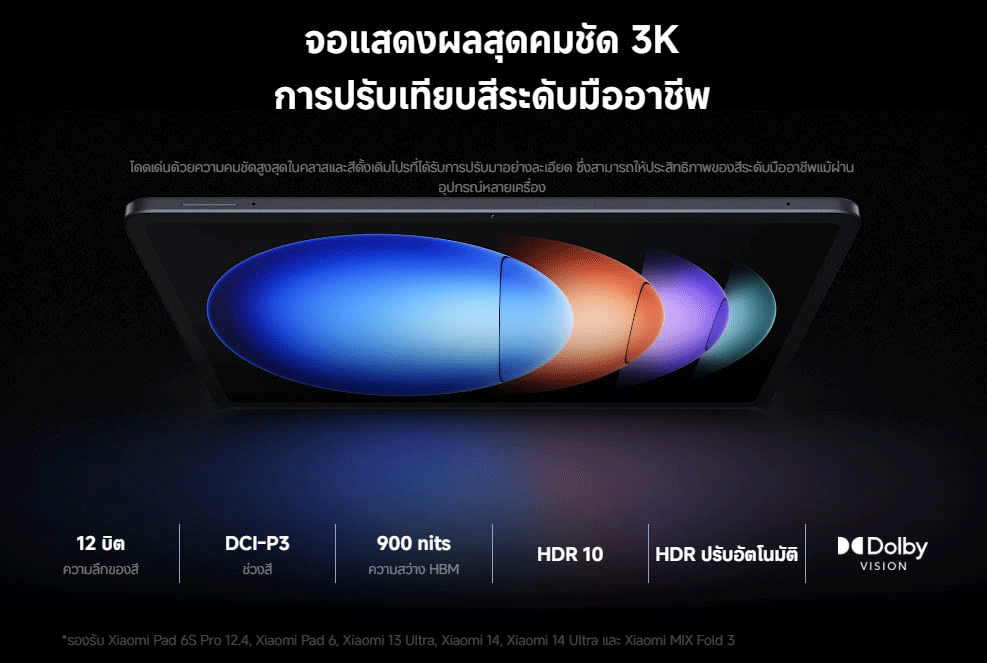 Xiaomi Pad 6s Pro แท็บเล็ตที่ช่วยคุณสร้างสรรค์ผลงานได้มากขึ้นบนหน้าจอขนาดใหญ่สะใจ กับความละเอียดระดับ 3K เสริมด้วยขุมพลังจากชิปที่ทรงประสิทธิภาพ ดื่มด่ำไปกับเสียงด้วยลำโพงถึง 6 ตัว และมาพร้อมแบตเตอรี่ที่มีอายุการใช้งานที่ยาวนาน พร้อมให้คุณใช้ทำงานหรือเพลิดเพลินไปกับแท็บเล็ตได้อย่างเต็มที่
